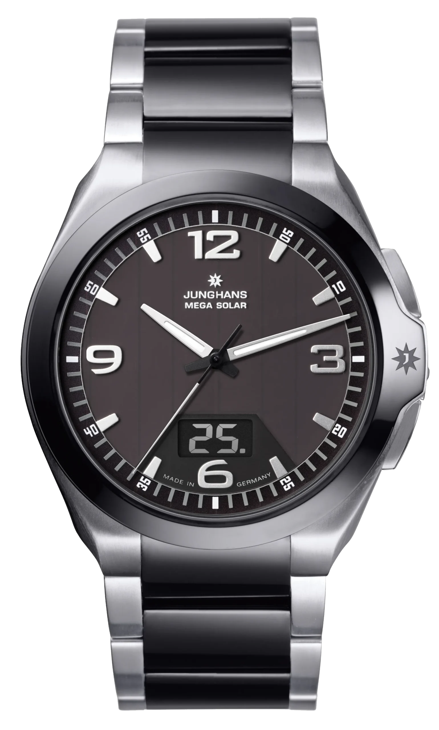 Kühler Edelstahl, kratzfeste Keramik und eine Wasserdichtheit bis 10 bar machen die Spektrum Mega Solar zu unserer sportlichsten Funkuhr. Angetrieben wird das Junghans Multifrequenz-Funkwerk im Inneren durch die Energie der Sonne. So erweist sich die Spektrum Mega Solar nicht nur als besonders präziser, sondern gleichzeitig auch als besonders ressourcenschonender Zeitmesser.